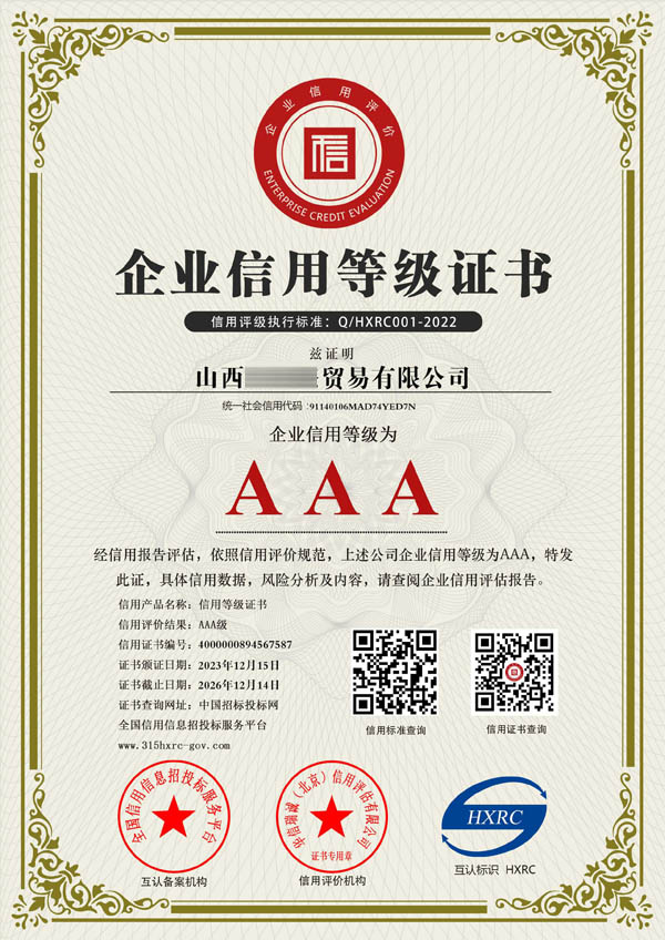 山西AAA企業(yè)信用評(píng)級(jí)網(wǎng)是從事企業(yè)認(rèn)證咨詢(xún)、各行業(yè)榮譽(yù)證書(shū)辦理的網(wǎng)站,認(rèn)證主要包含企業(yè)AAA信用等級(jí)證書(shū)、ISO體系認(rèn)證、服務(wù)認(rèn)證等認(rèn)證產(chǎn)品。出證快、價(jià)格優(yōu)。 企業(yè)AAA信用等級(jí)證書(shū)主要包含:AAA企業(yè)信用等級(jí)、AAA企業(yè)資信等級(jí)、AAA重合同守信用、AAA質(zhì)量服務(wù)誠(chéng)信企業(yè)、AAA誠(chéng)信經(jīng)營(yíng)示范單位、誠(chéng)信企業(yè)家、誠(chéng)信經(jīng)理人、AAA重質(zhì)量守信用、AAA重服務(wù)守信用、AAA誠(chéng)信供應(yīng)商等。我們將一如既往繼續(xù)努力,能夠和您合作是我們的榮幸!山西AAA企業(yè)信用評(píng)級(jí)網(wǎng)本著“誠(chéng)信、專(zhuān)業(yè)、優(yōu)質(zhì)、高效”的宗旨為廣大客戶(hù)提供全方位的認(rèn)證咨詢(xún)服務(wù),本公司愿與廣大的新老客戶(hù)真誠(chéng)合作、攜手共進(jìn)! |